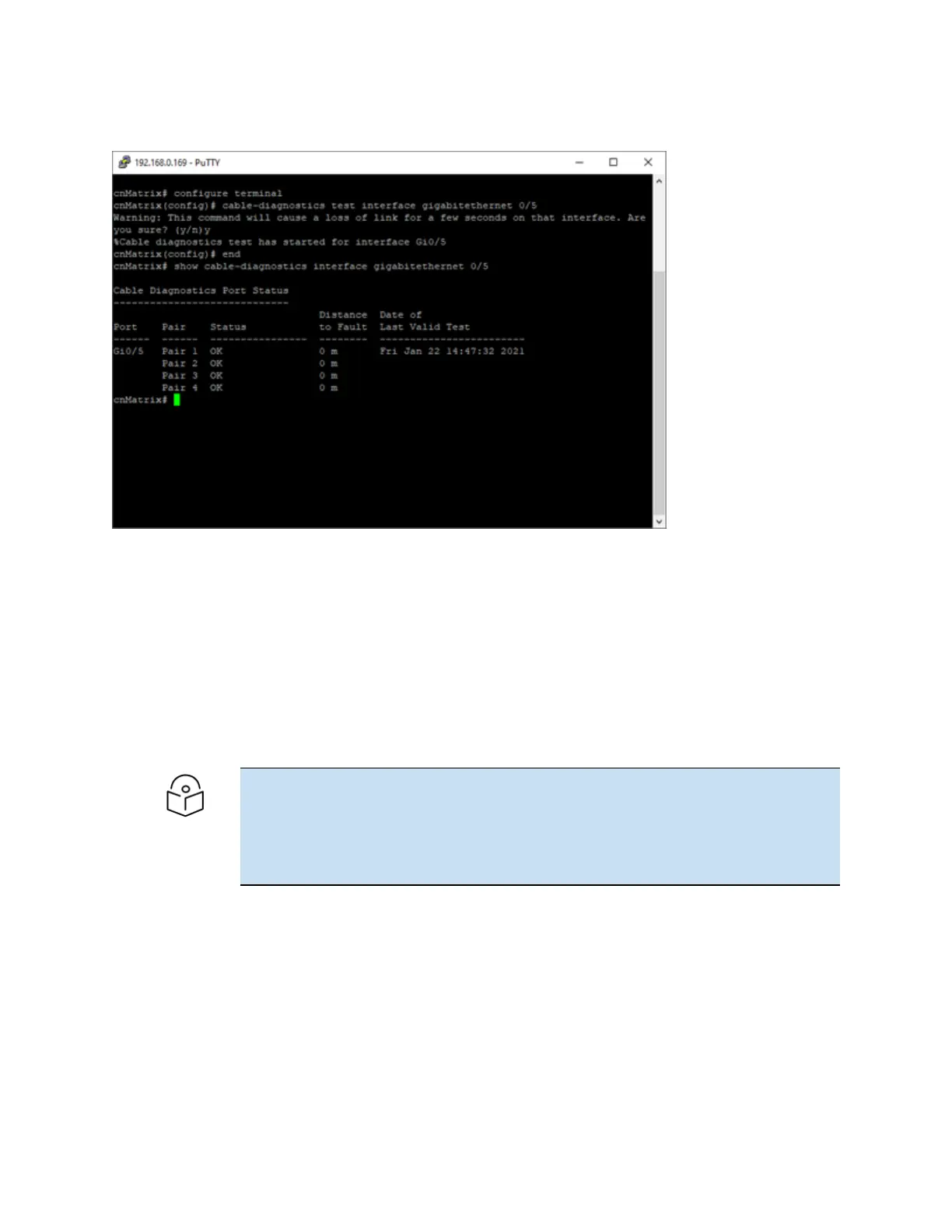 Example: cnMatrix(config)# cable-diagnostics test interface gigabitethernet 0/5