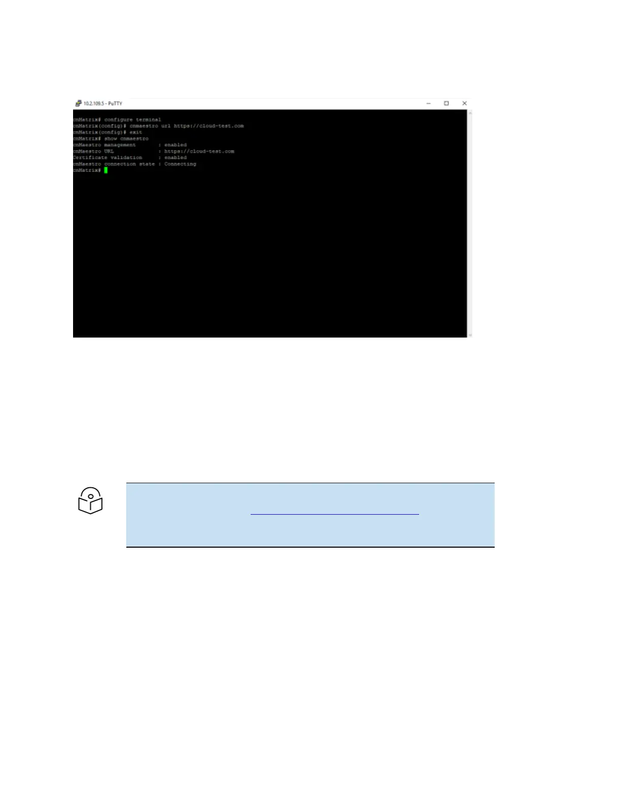 4. Type the show cnmaestro command into the terminal to display cnMaestro information. Press the