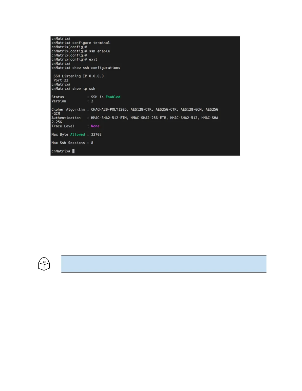 cnMatrix# show ssh-configurations