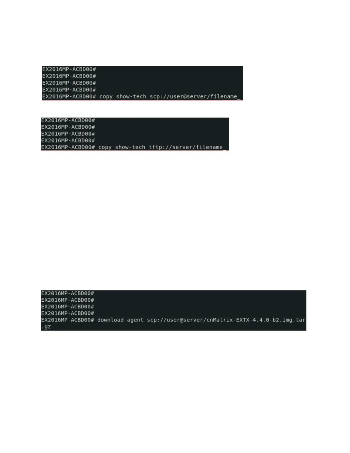 Type the copy show-tech scp://user@server/filename command into the terminal. Press the Enter key.