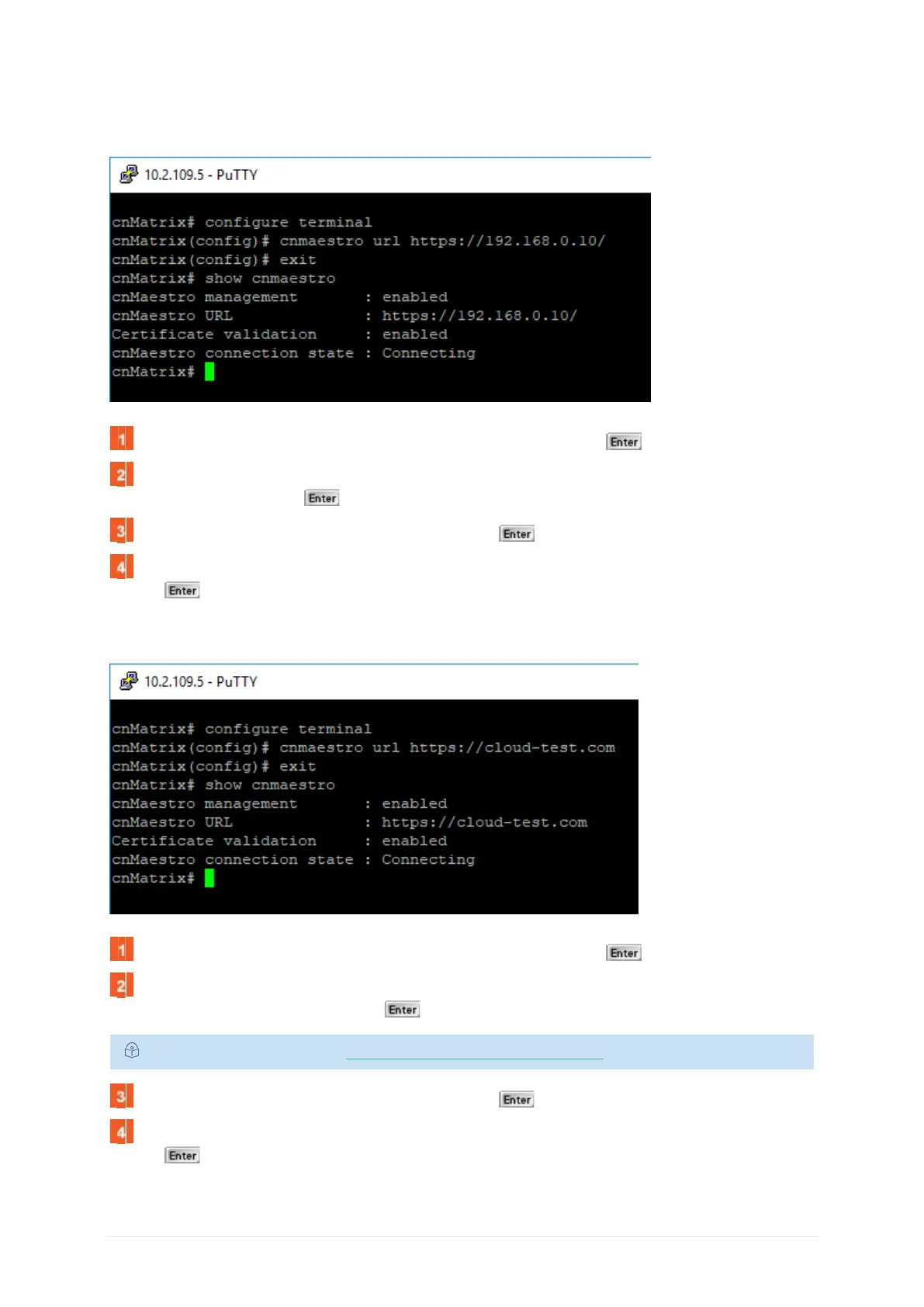 Type the show cnmaestro command into the terminal to display cnMaestro information. Press