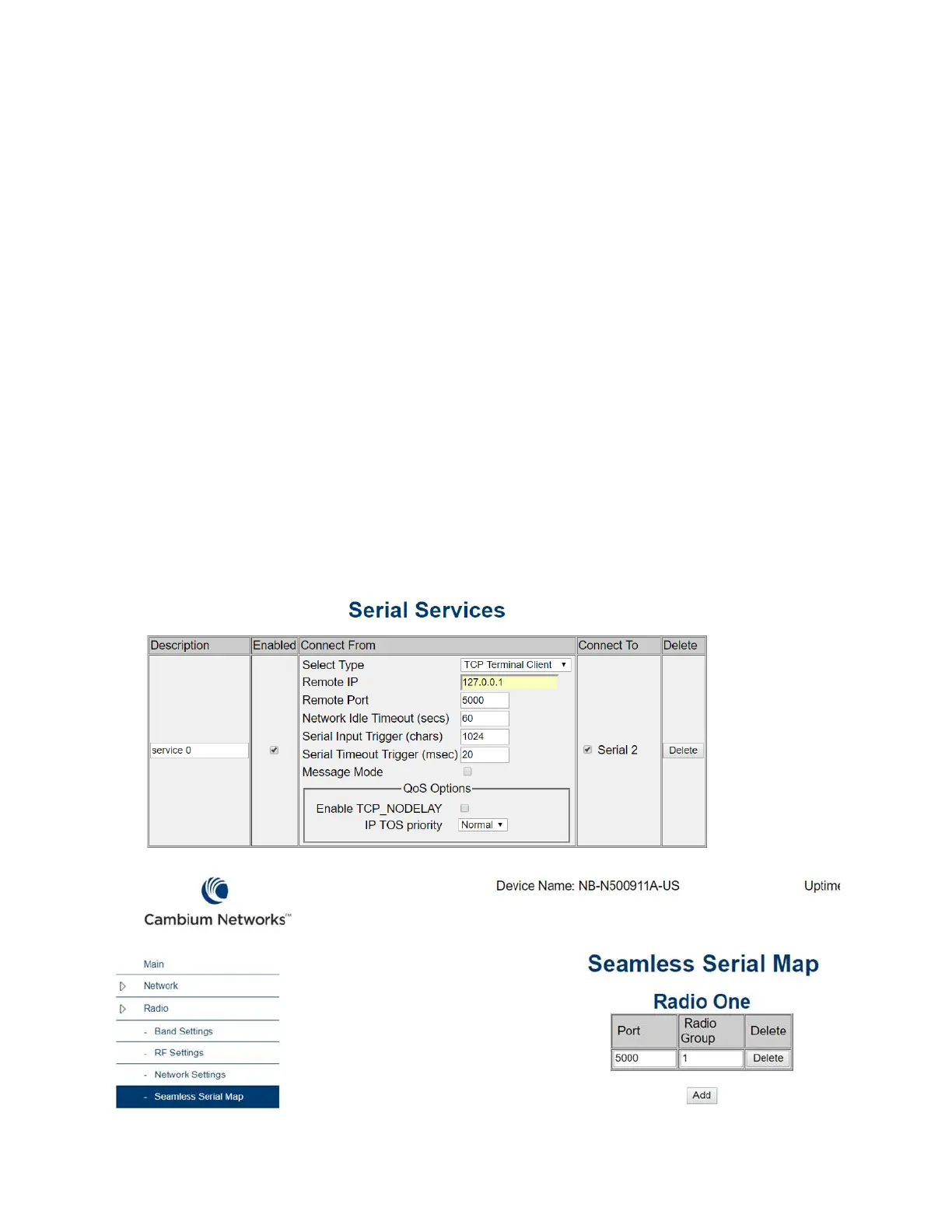 To configure seamless serial, on a radio, configure a regular serial service TCP terminal client with the