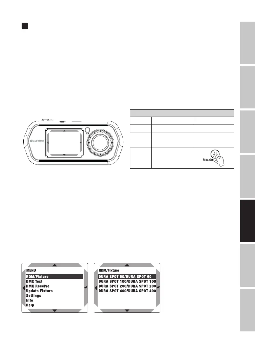 Wybrać punkt menu RDM/Fixture za pomocą pokrętła lub naciskając symbole strzałek lub