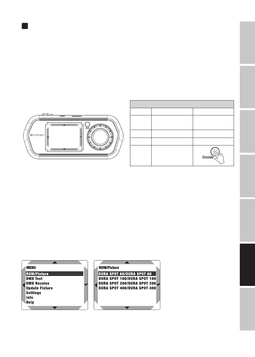 Selezioni la voce di menu RDM/Fixture utilizzando l'encoder a rotazione o premendo i simboli
