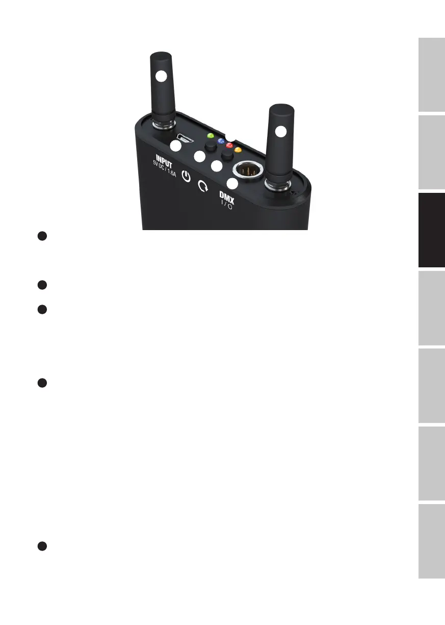 LED orange : indique l’état du signal W-DMX. Après que la procédure de couplage avec un appareil compatible W-DMX a démarré (cf. section