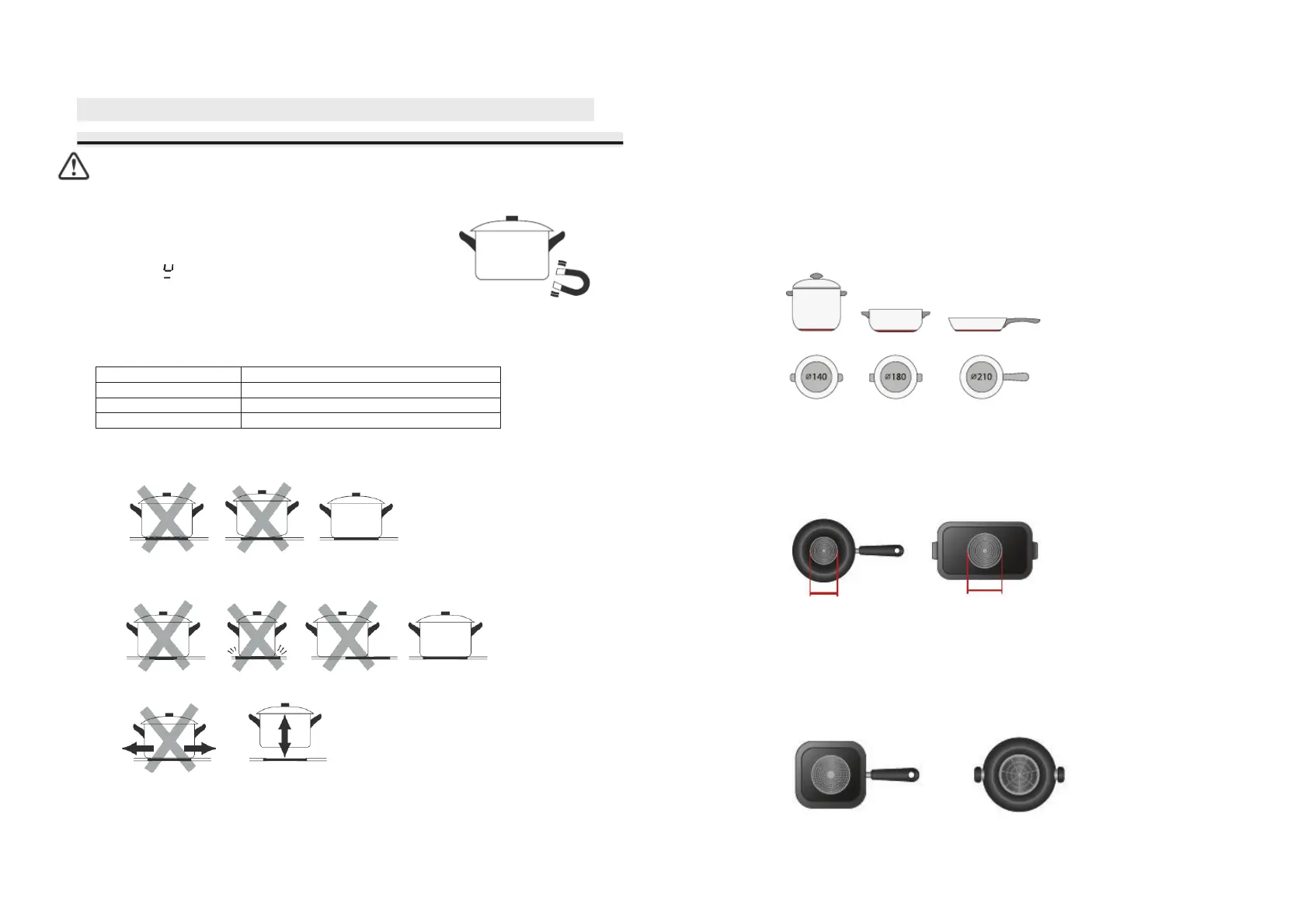 x Use pans whose diameter of the ferromagnetic area (base of the pan) is in the