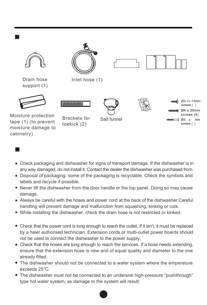 Check packaging and dishwasher for signs of transport damage. If the dishwasher is in