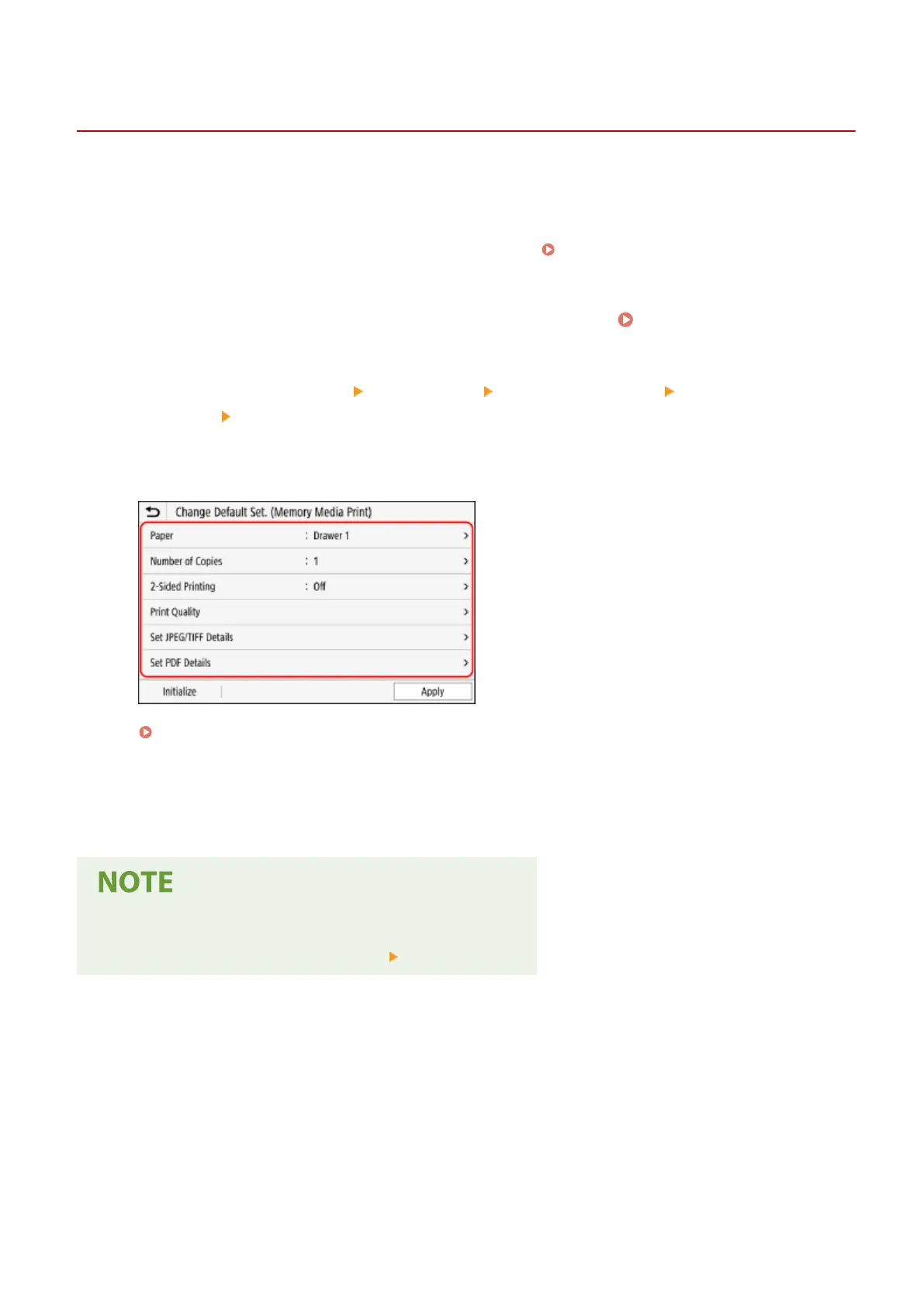 You can change the default settings for the Memory Media Print function called up using the control panel.