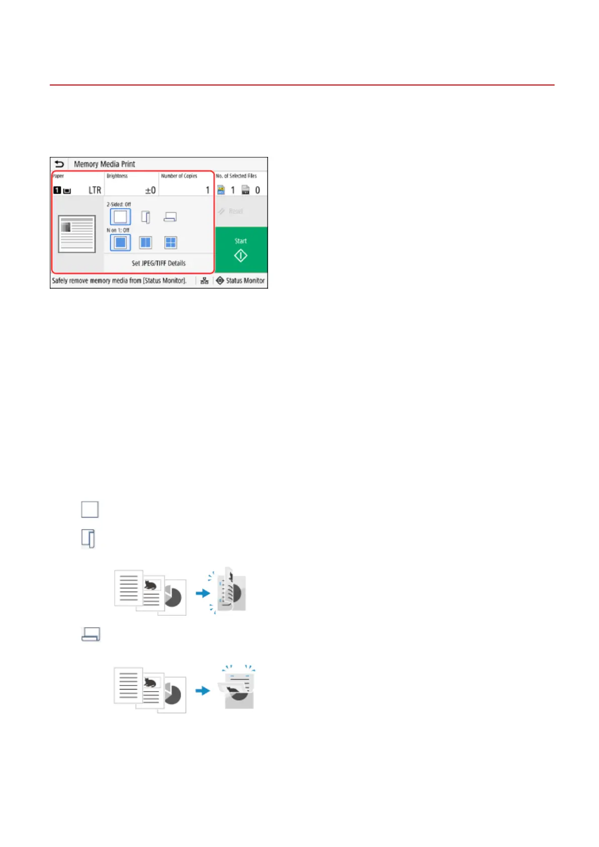 You can use the Memory Media Print settings screen to select the paper to use, set 2-sided printing, and congure