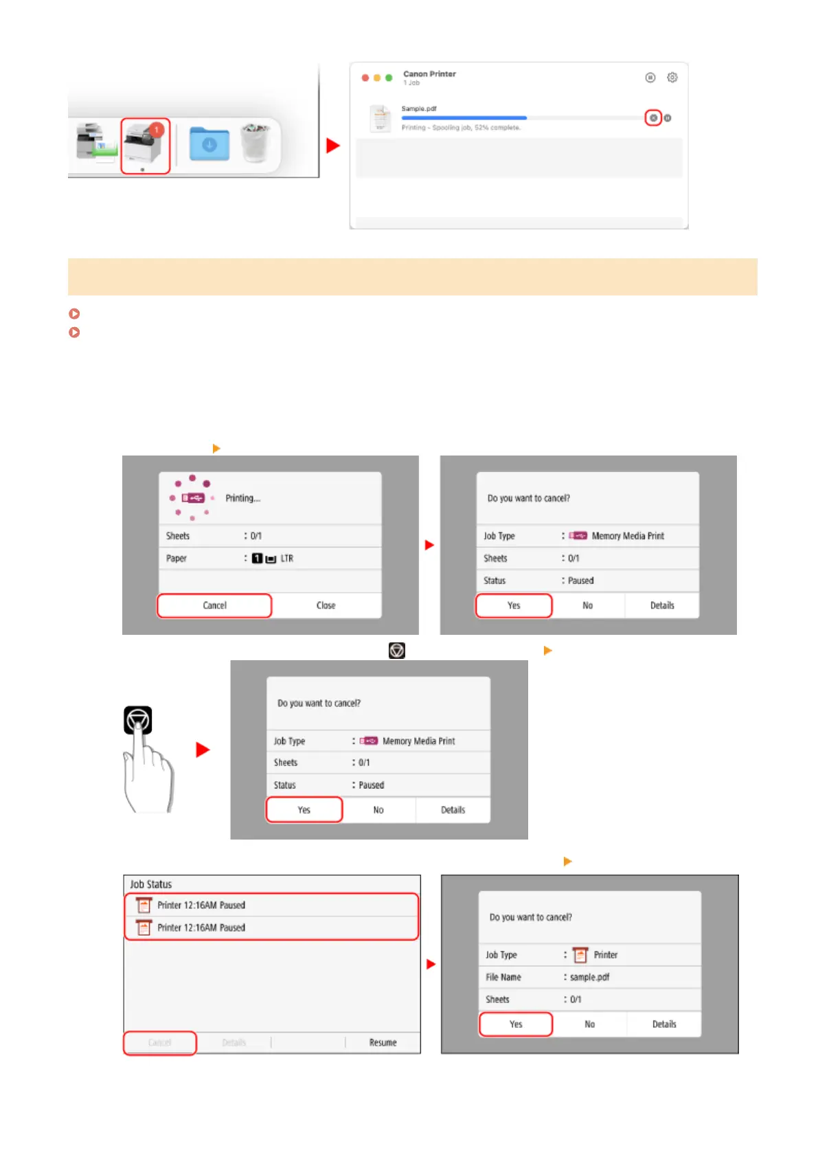 If the job list screen is displayed, select the job to cancel, and press [Cancel] [Yes].