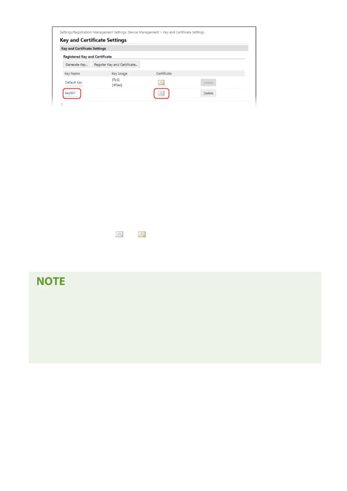 ● Click the key name (or certicate icon) in [Registered Key and Certicate] on the [Key and Certicate Settings]