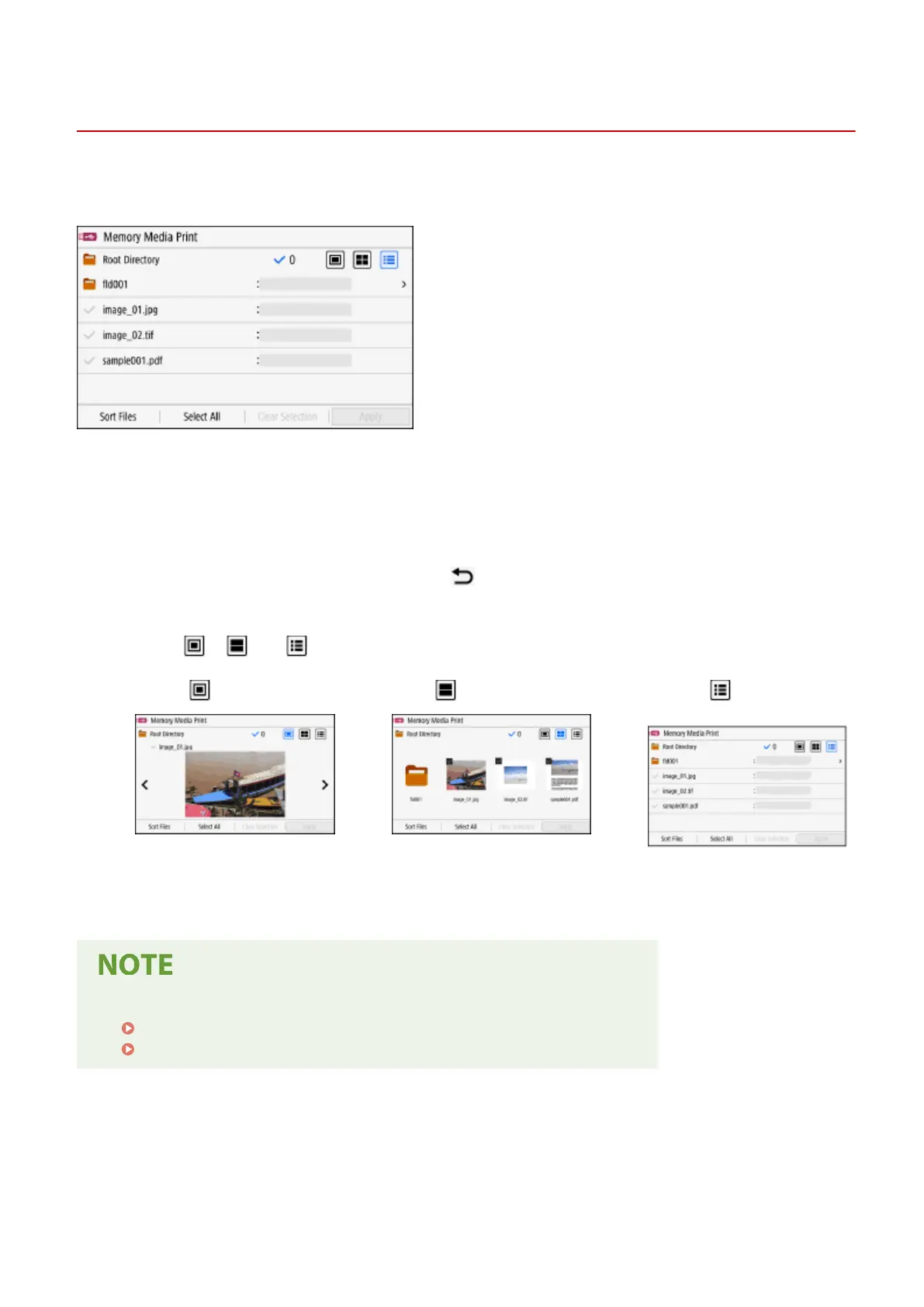 Press [ ], [ ], or [ ] at the top right of the screen to change the way les are displayed.