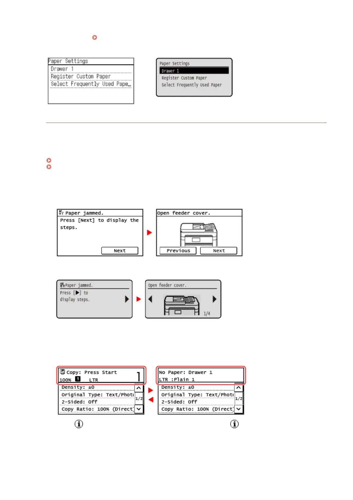 Messages are displayed on the screen when errors occur and the machine is out of paper or toner in the toner