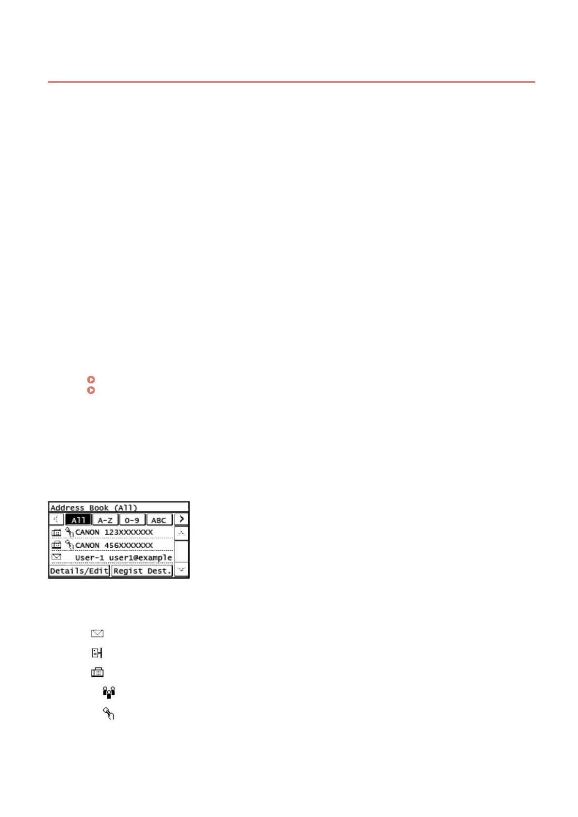 When you call the Address Book from the [Home] screen or scan or fax screen, the following screen is displayed.