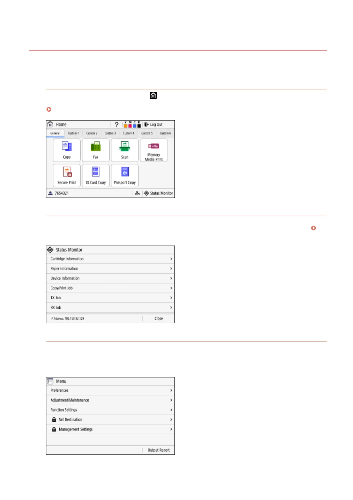 This screen is displayed when you press [Status Monitor] on the [Home] screen and other locations. Use this