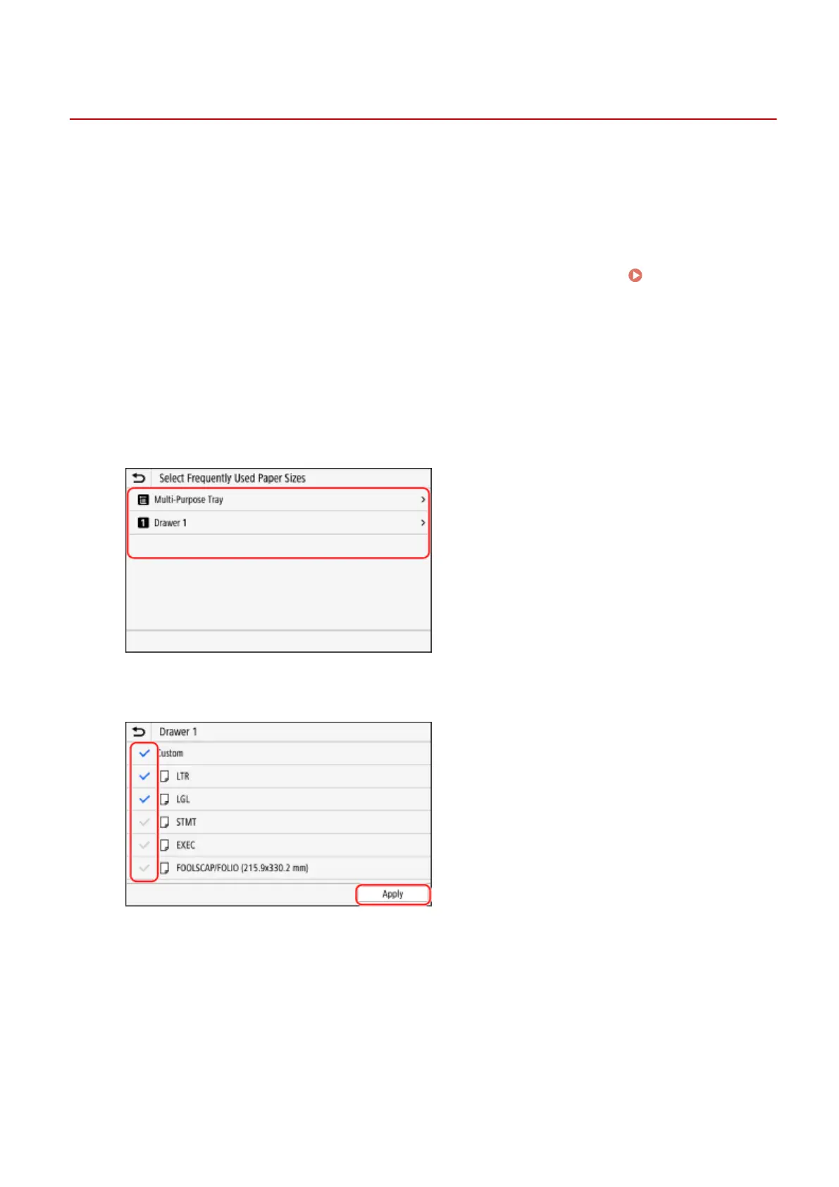 ➠ Paper sizes whose checkboxes are cleared are not displayed on the paper settings screen.