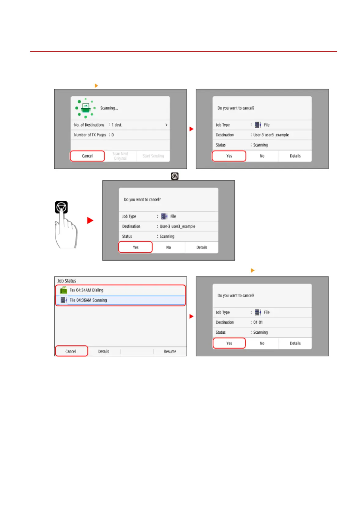 If the job list screen is displayed, select the job to cancel, and press [Cancel] [Yes].