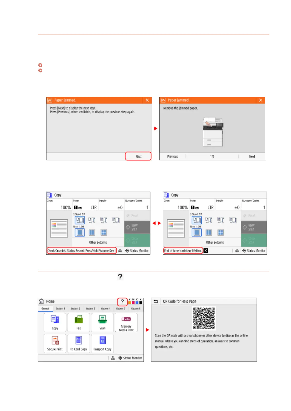 Messages are displayed on the screen when errors occur and the machine is out of paper or toner in the toner