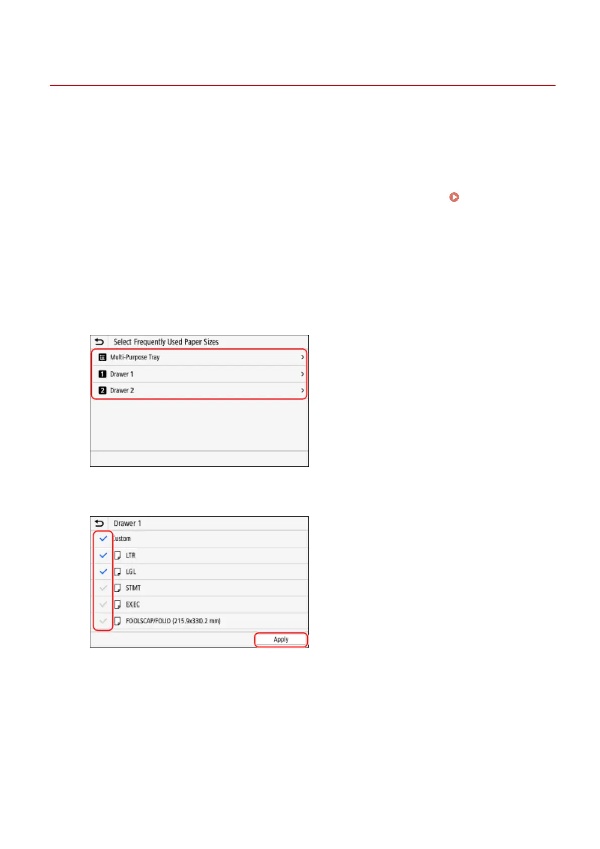 ➠ Paper sizes whose checkboxes are cleared are not displayed on the paper settings screen.