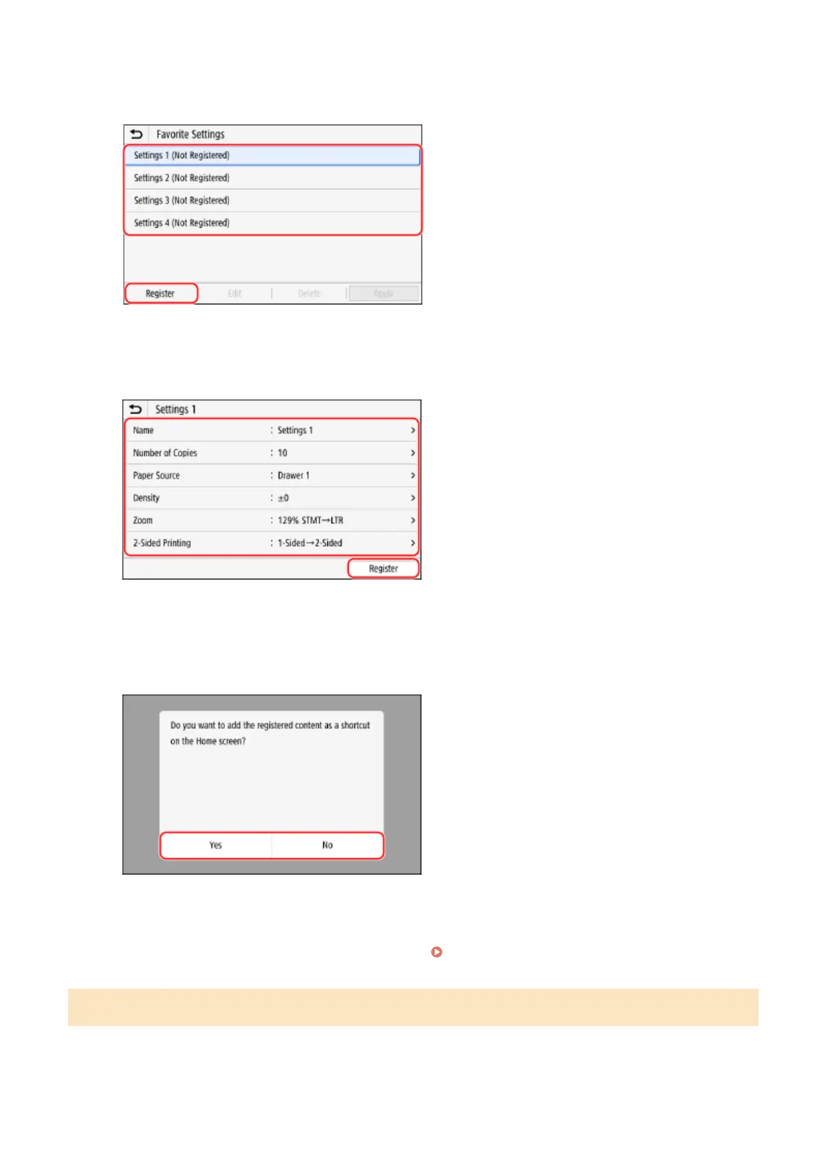 ● When you select [No], the Favorite Setting is registered but a shortcut button is not added. You can add a