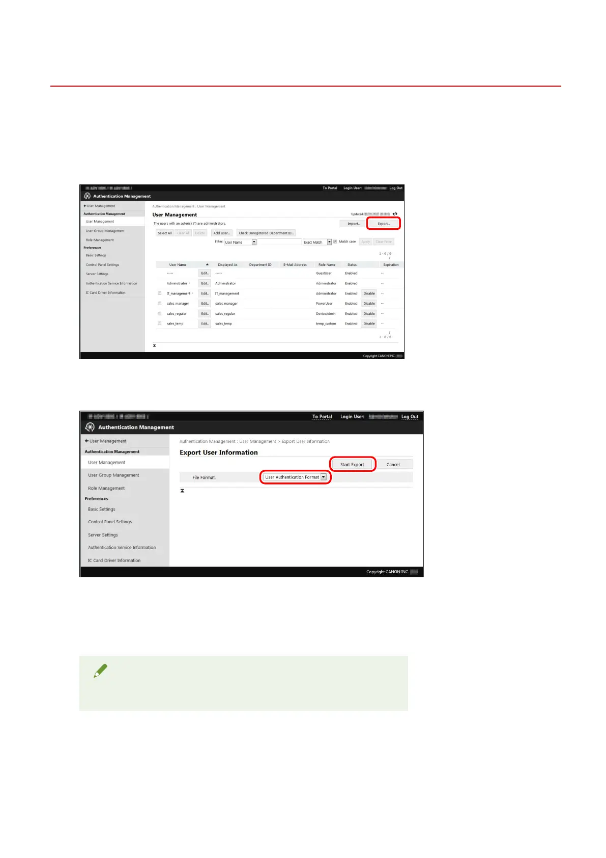 Conrm that [User Authentication Format] is selected → click [Start Export].