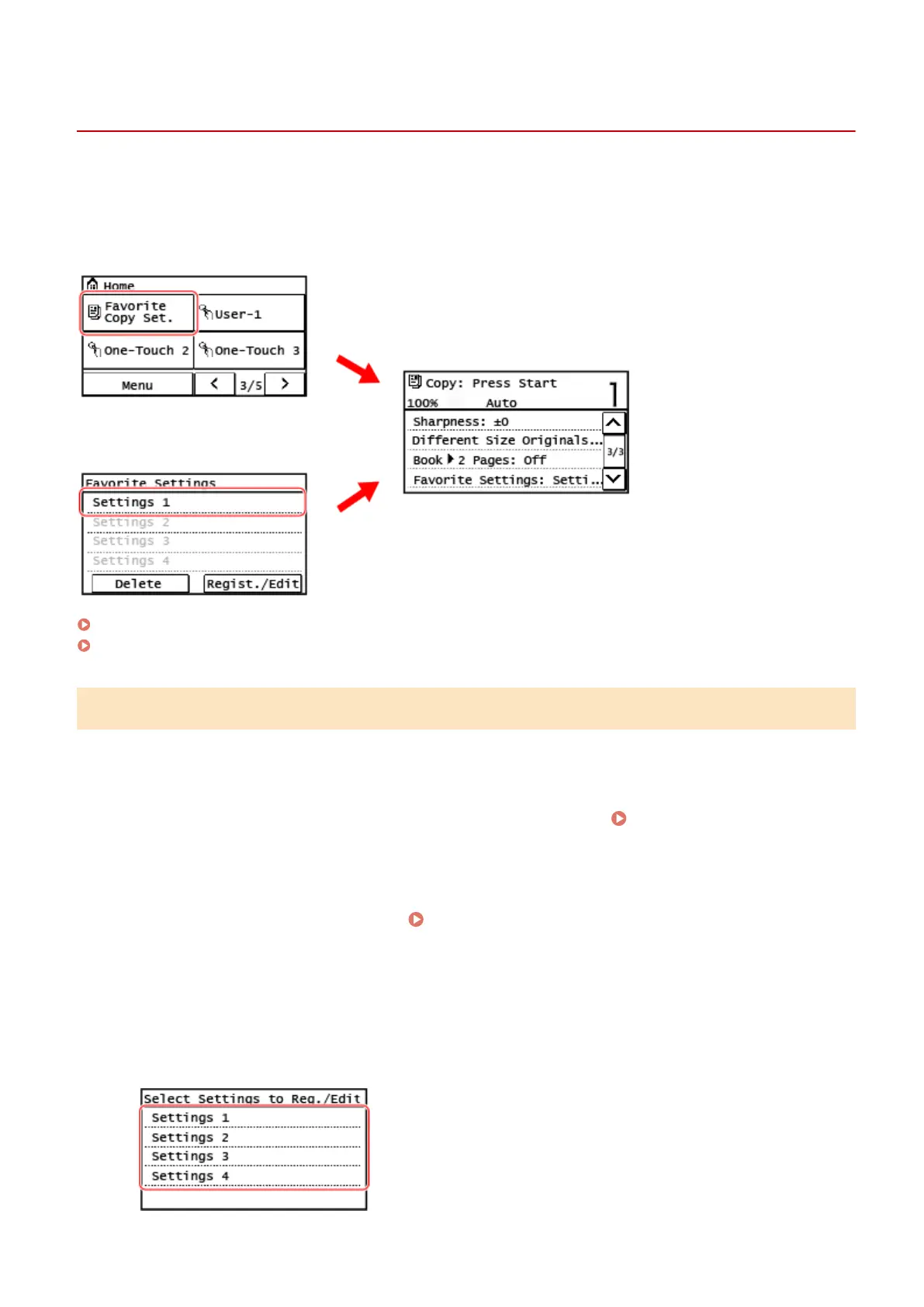 You can register settings according to your purpose and settings you want to recall as "Favorite Settings" for the copy