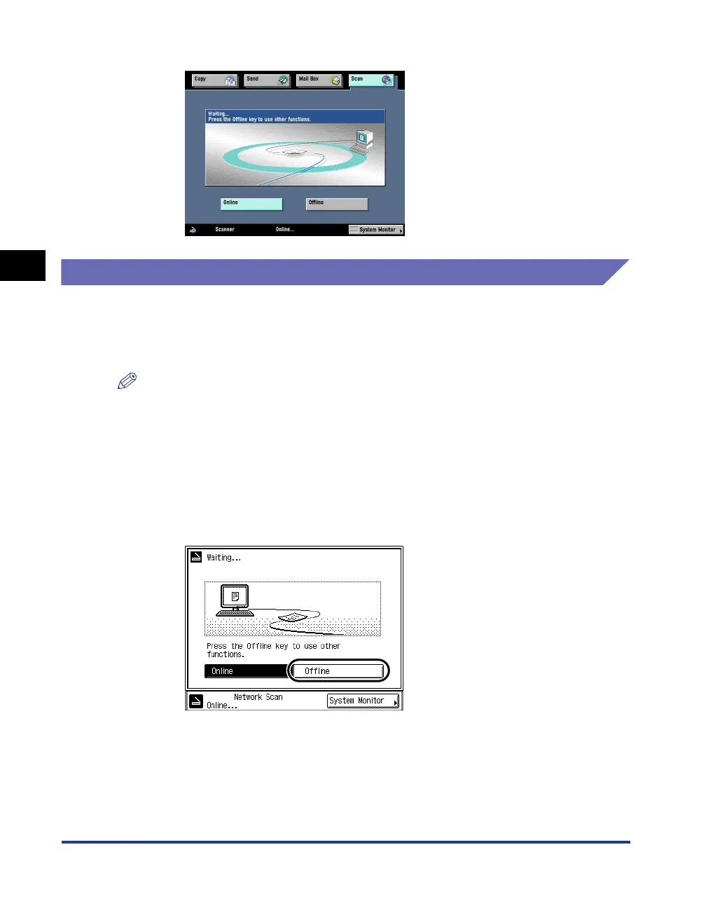 The procedure for switching the scanner offline depends on whether or not scanning is in