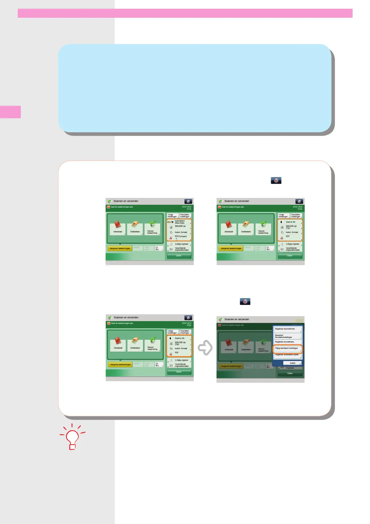 Aangeven van de scaninstellingen en de bestandsindeling → druk op → [Wijzig standaard