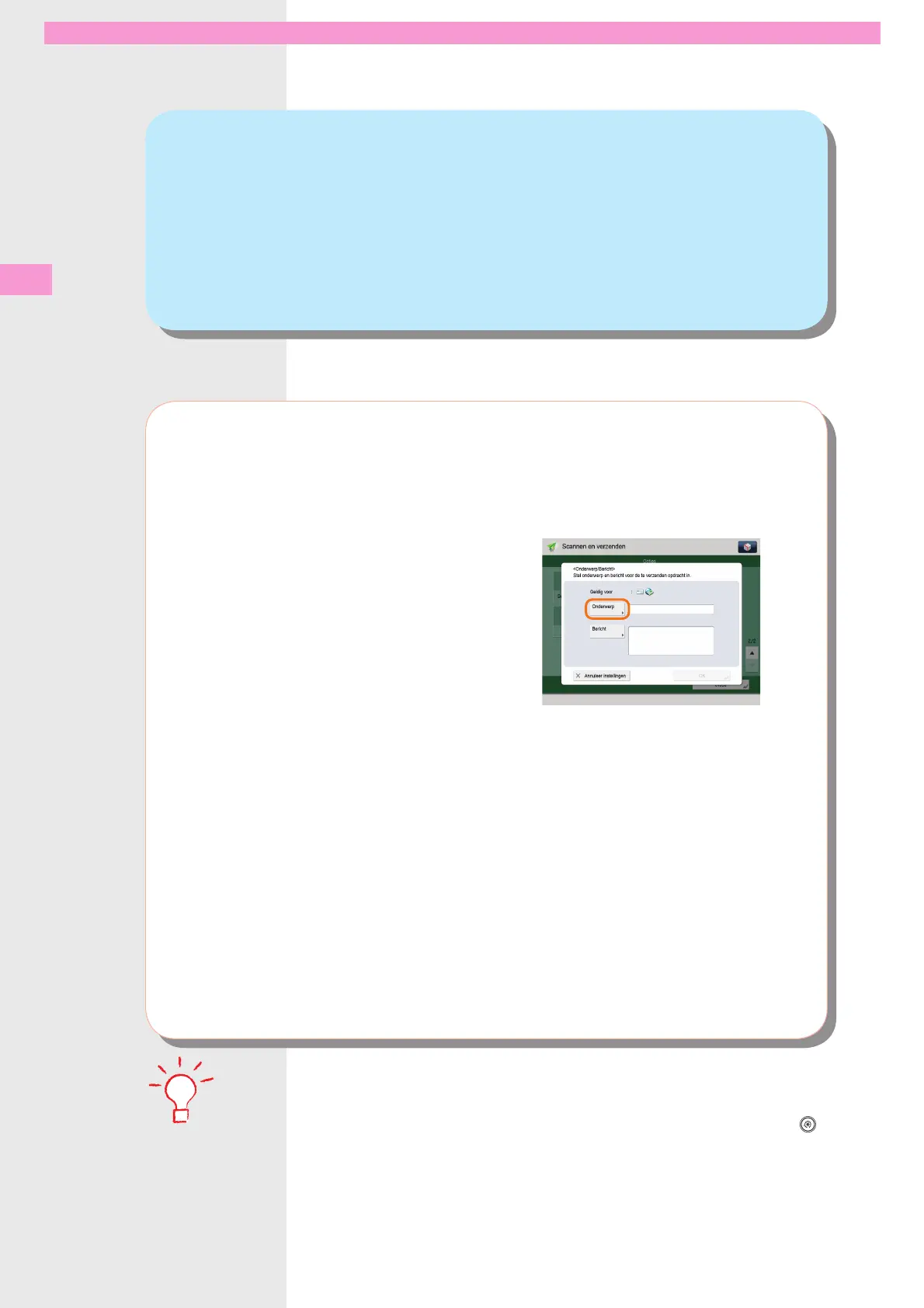 Druk op [Scannen en verzenden] → geef de bestemming op → druk op [Opties] → [Onderwerp/
