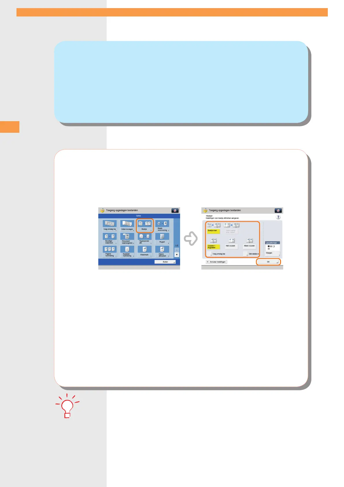 [Afdrukken] → [Wijzig afdrukinstellingen] → [Opties] → [Boekje] → [Boekje scan] → [Vouwen + rugnieten] →