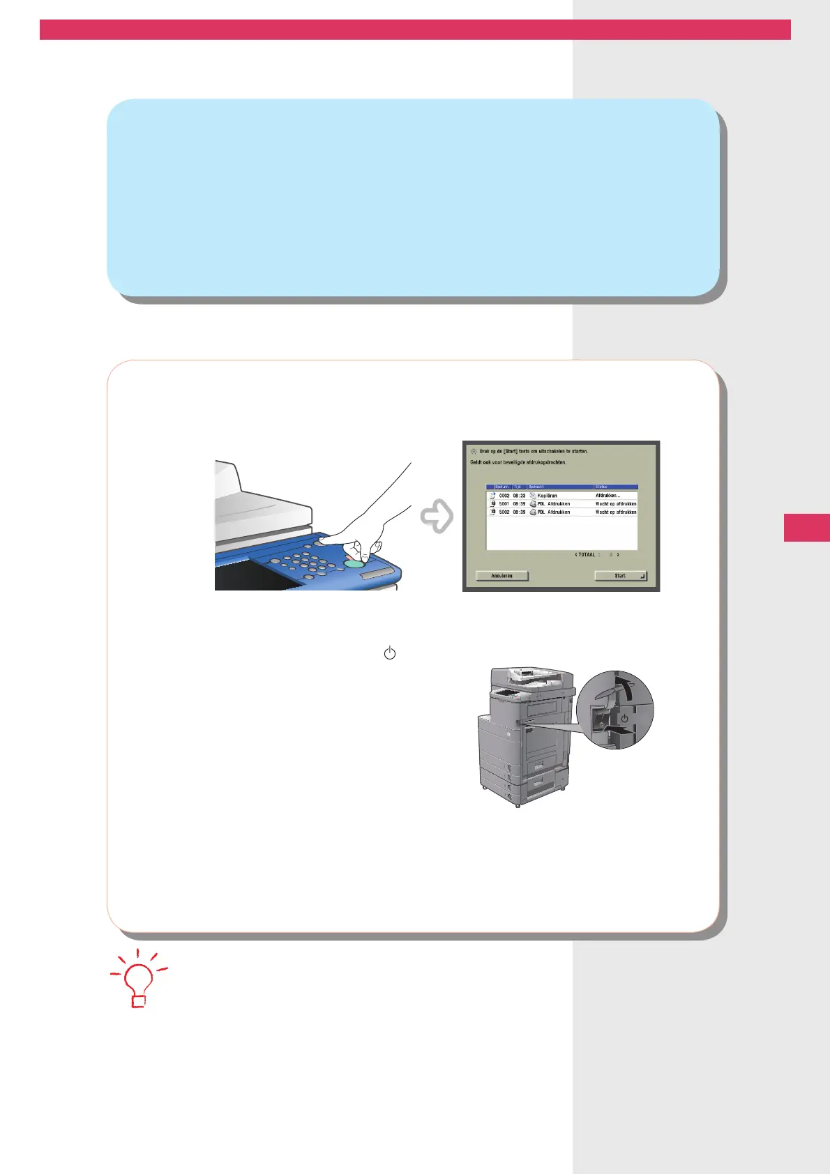 Voor instructies m.b.t. het uitschakelen van de machine raadpleegt u e-Handleiding > Voordat u deze machine