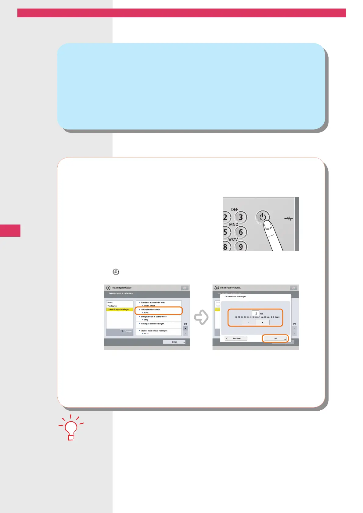 Druk op → [Voorkeuren] → [Tijdklok/energie-instellingen] → [Automatische sluimertijd] →