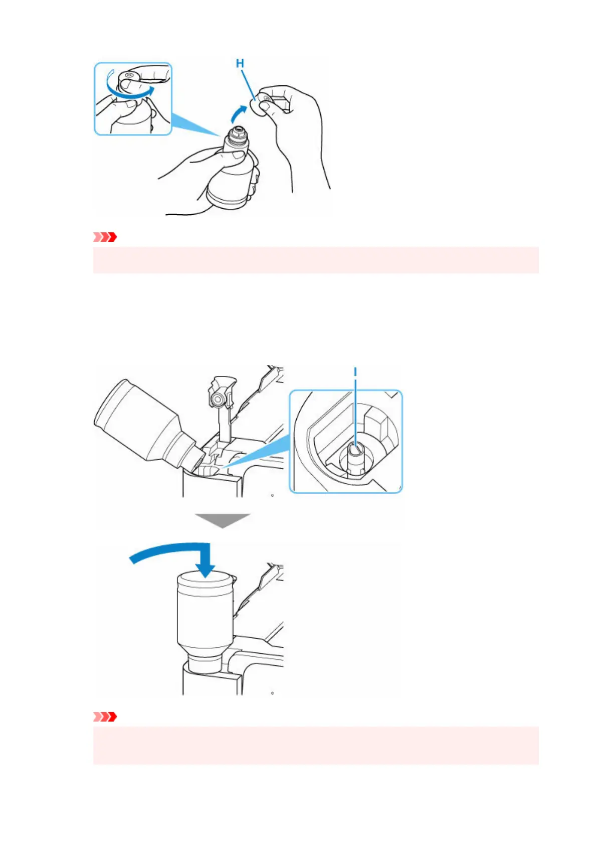Aligning the ink bottle's tip with the ink tank's inlet (I), slowly stand the bottle upside down, and push