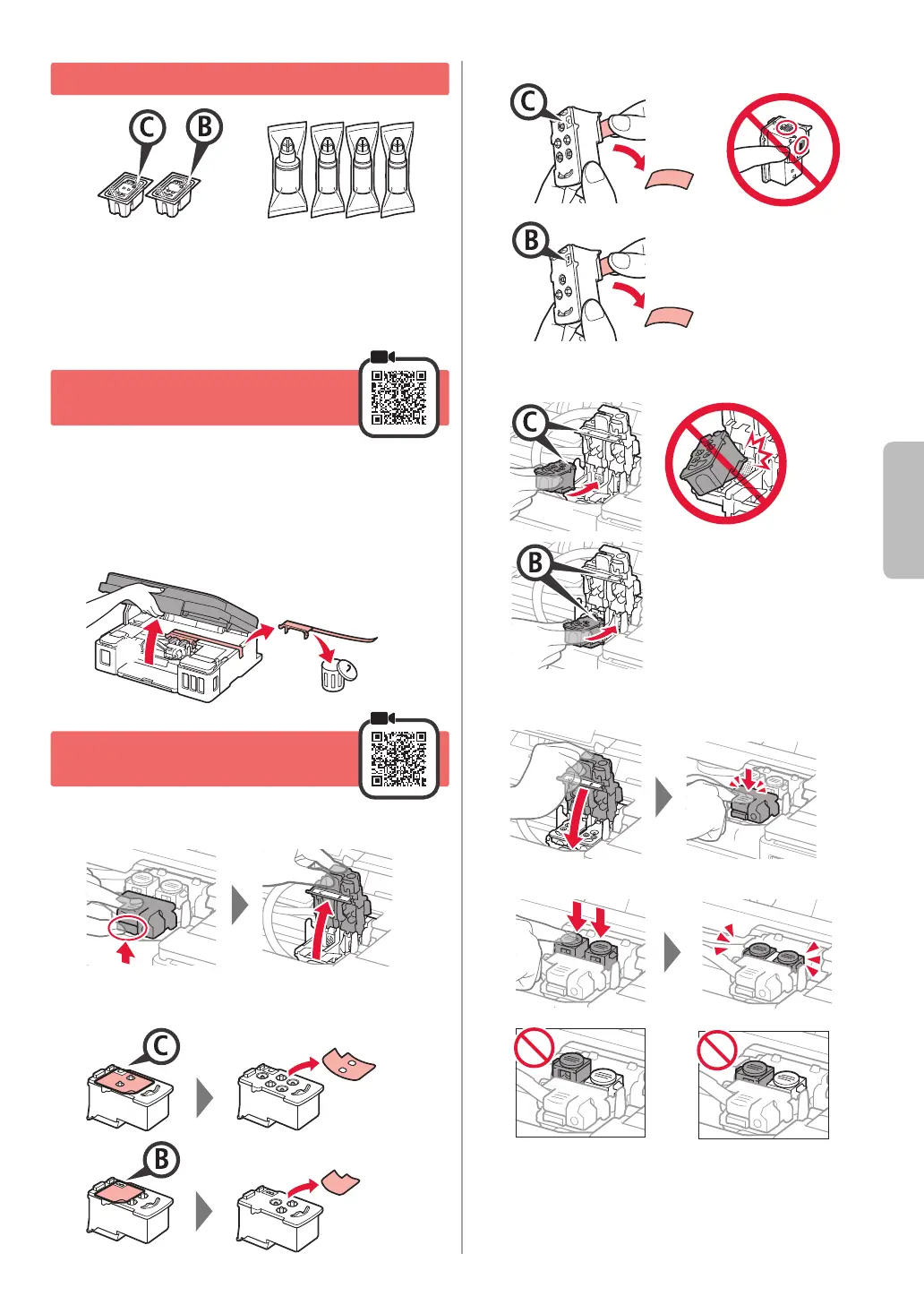 Įdėkite C (spalvotą) kasetę į kairę ir B (juodą)