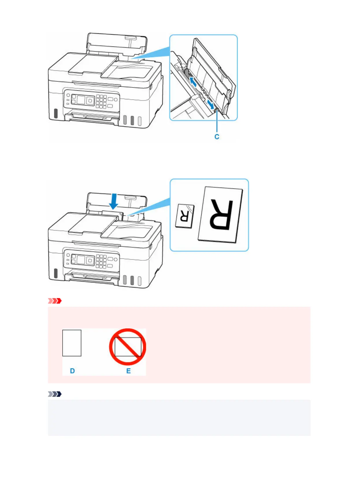 • Always load paper in portrait orientation (D). Loading paper in landscape orientation (E) can•