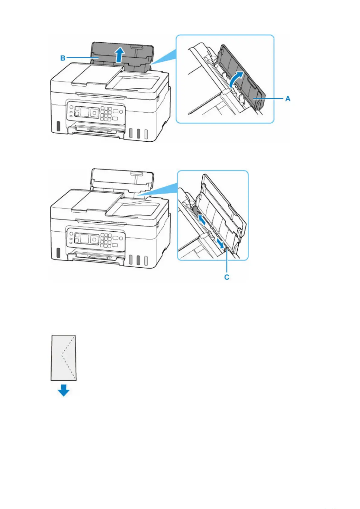 Fold flap of the envelope and load the envelope in portrait orientation with the address side facing up.