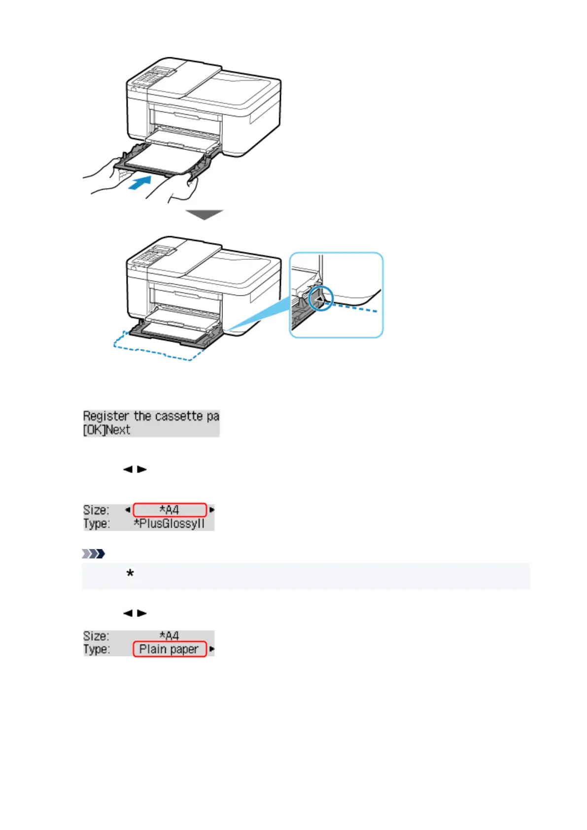 Use the button to select the size of the loaded paper in the cassette, then press the