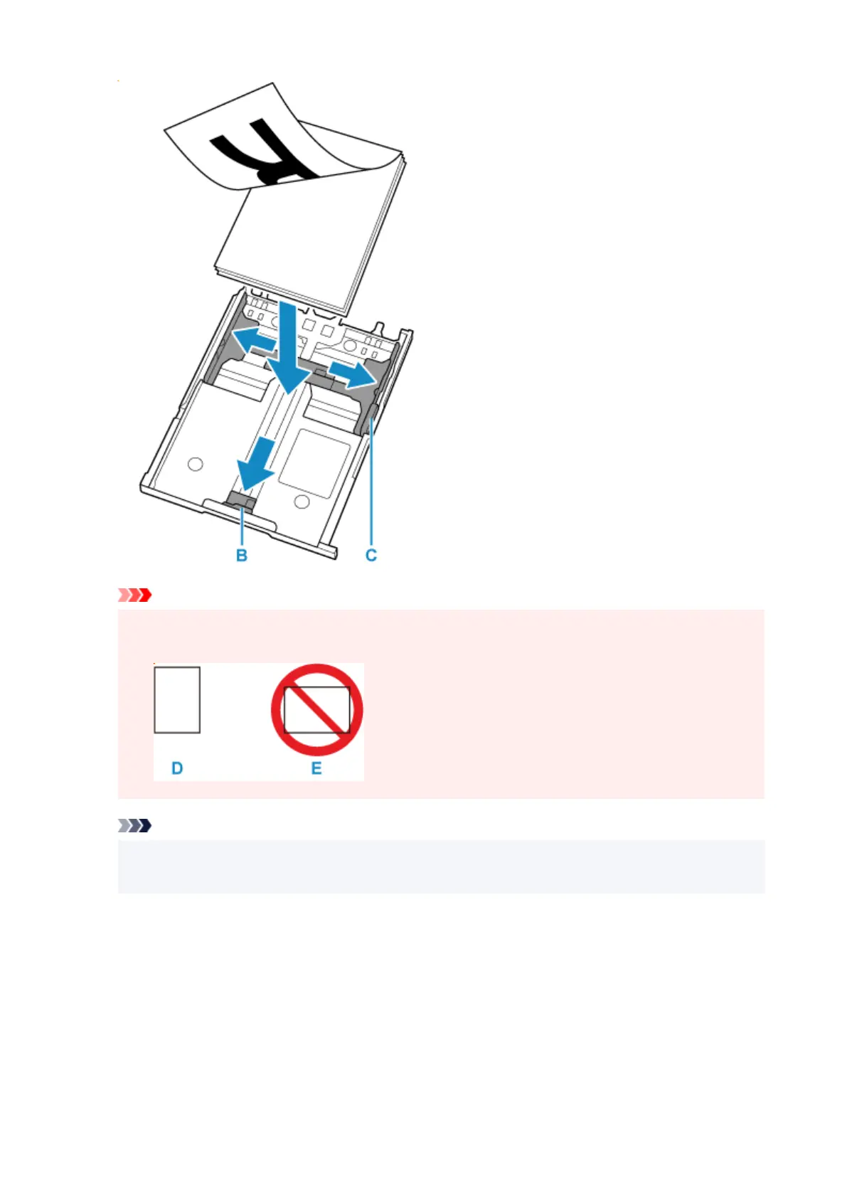 Always load paper in portrait orientation (D). Loading paper in landscape orientation (E) can