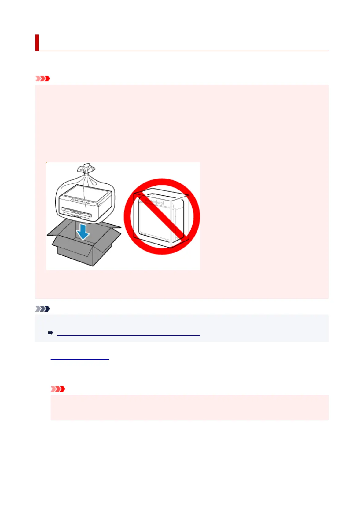 • When transporting the printer, pack the printer in a plastic bag so that ink does not leak.•