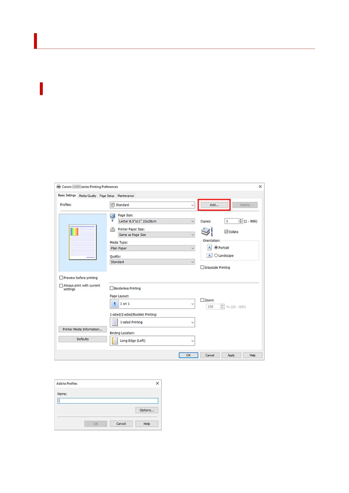 You can register the frequently used printing profile to Profiles on the Basic Settings tab. Unnecessary