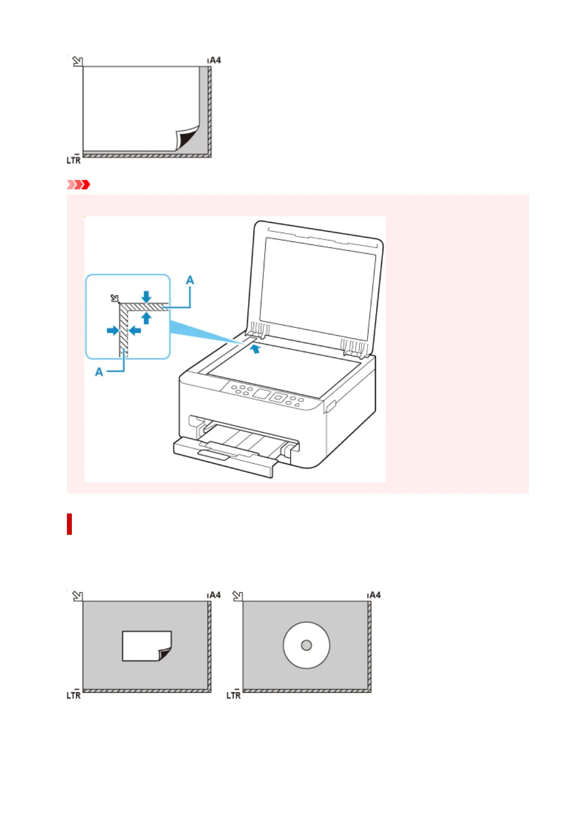 • The printer cannot scan the striped area (A) (0.04 in. (1 mm) from the edges of the platen glass).•