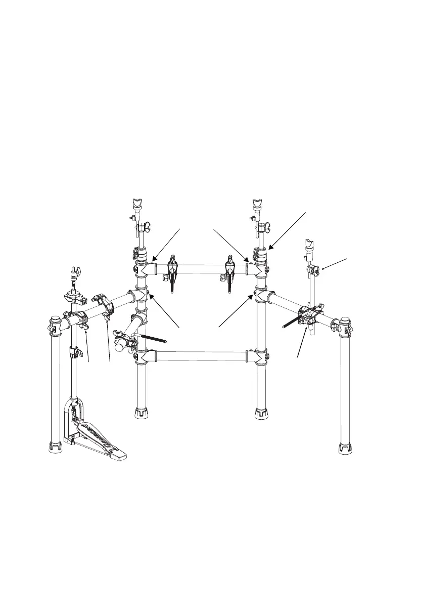 1. The horizontal frame bars and snare arm can be adjusted up and down to suit drummers of
