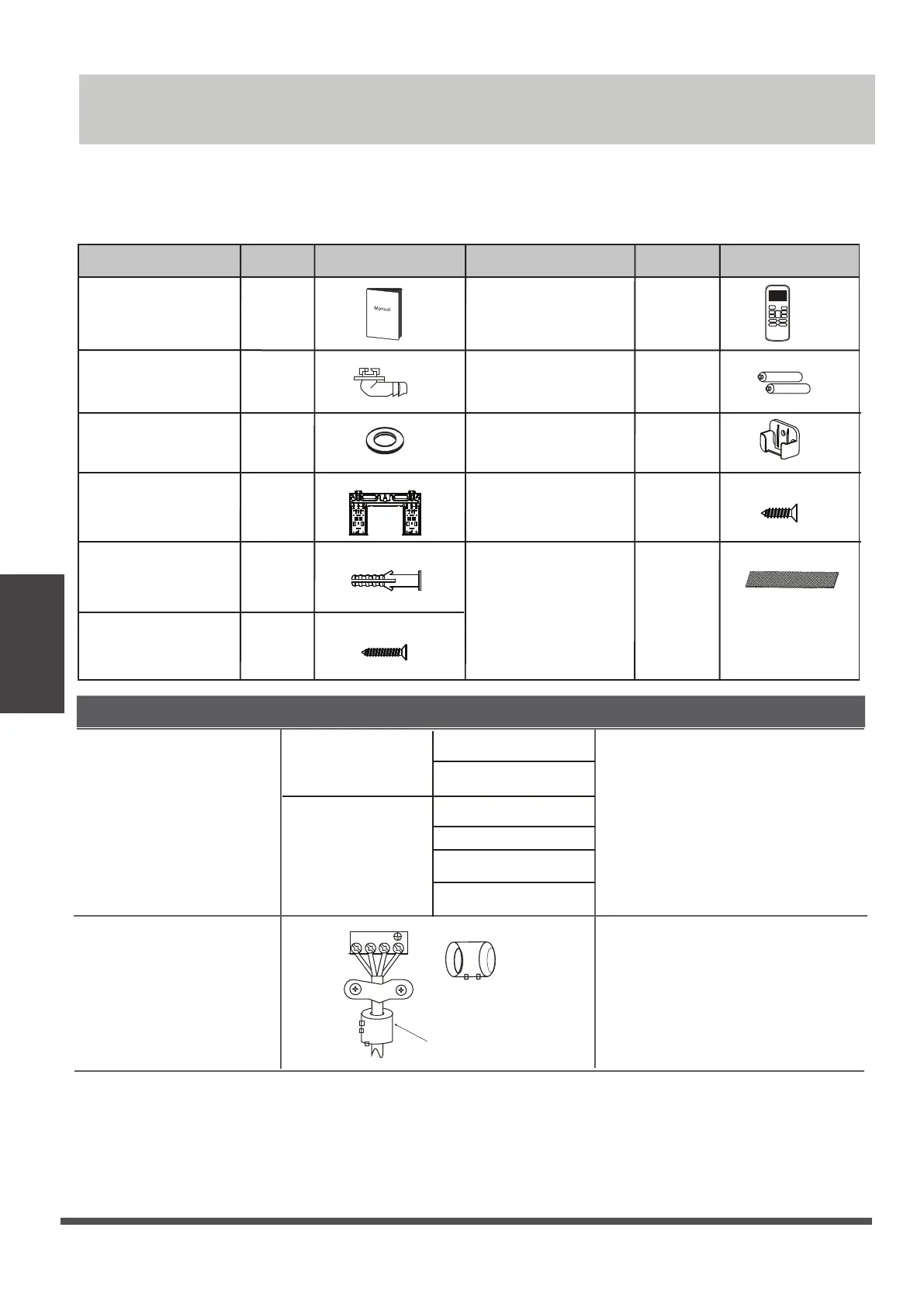 and accessories to install the air conditioner. Improper installation may result in water leakage,