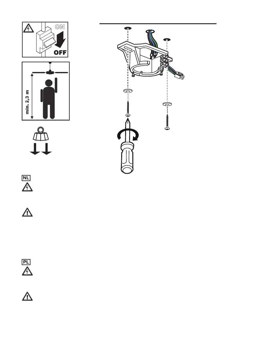 - Gebruik alleen voor uw type plafond geschikte schroeven en pluggen (niet bij de