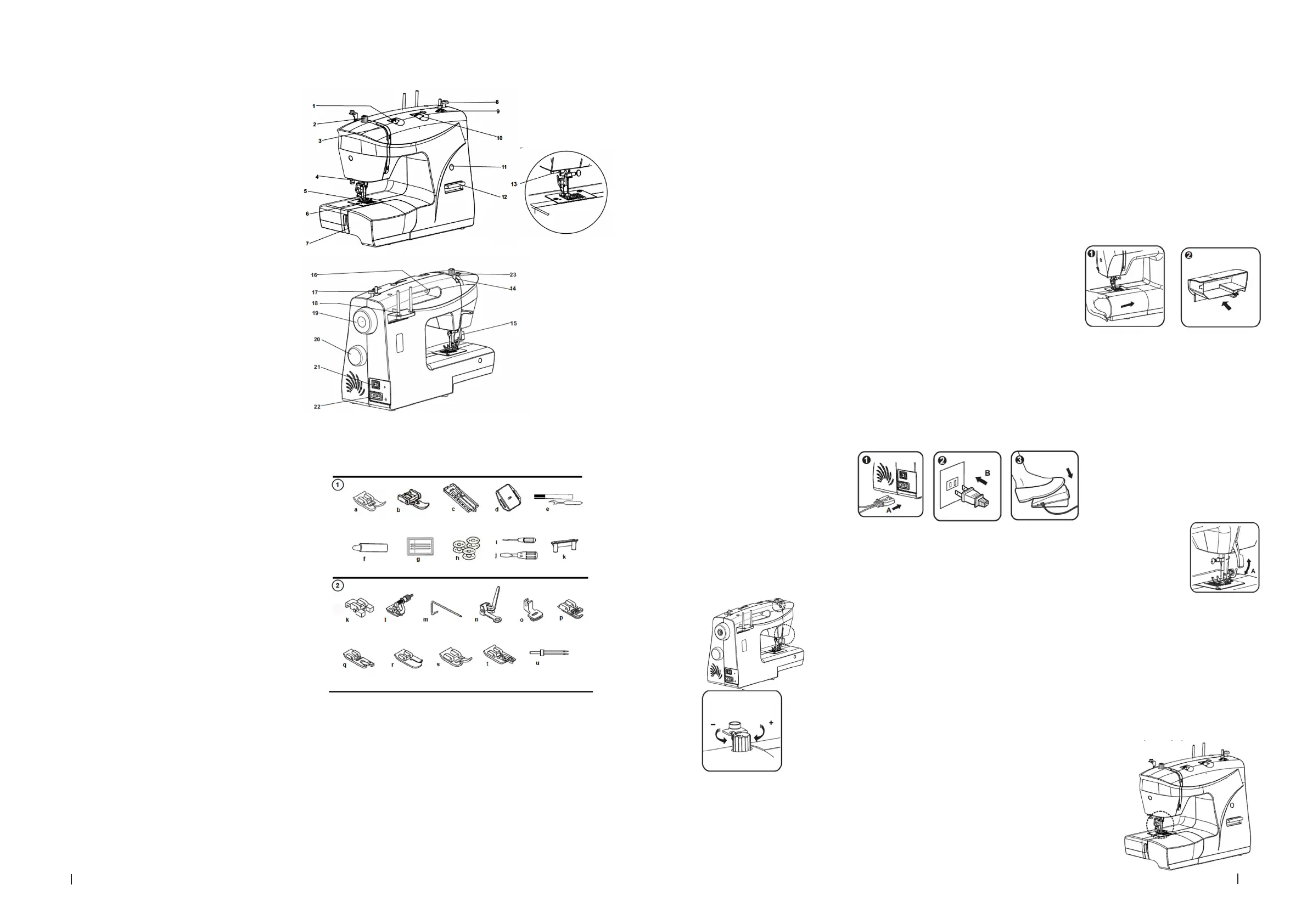 - Pour démarrer la machine, appuyez sur la pédale (3). La vitesse est réglée par la pression exercée sur celle-ci.