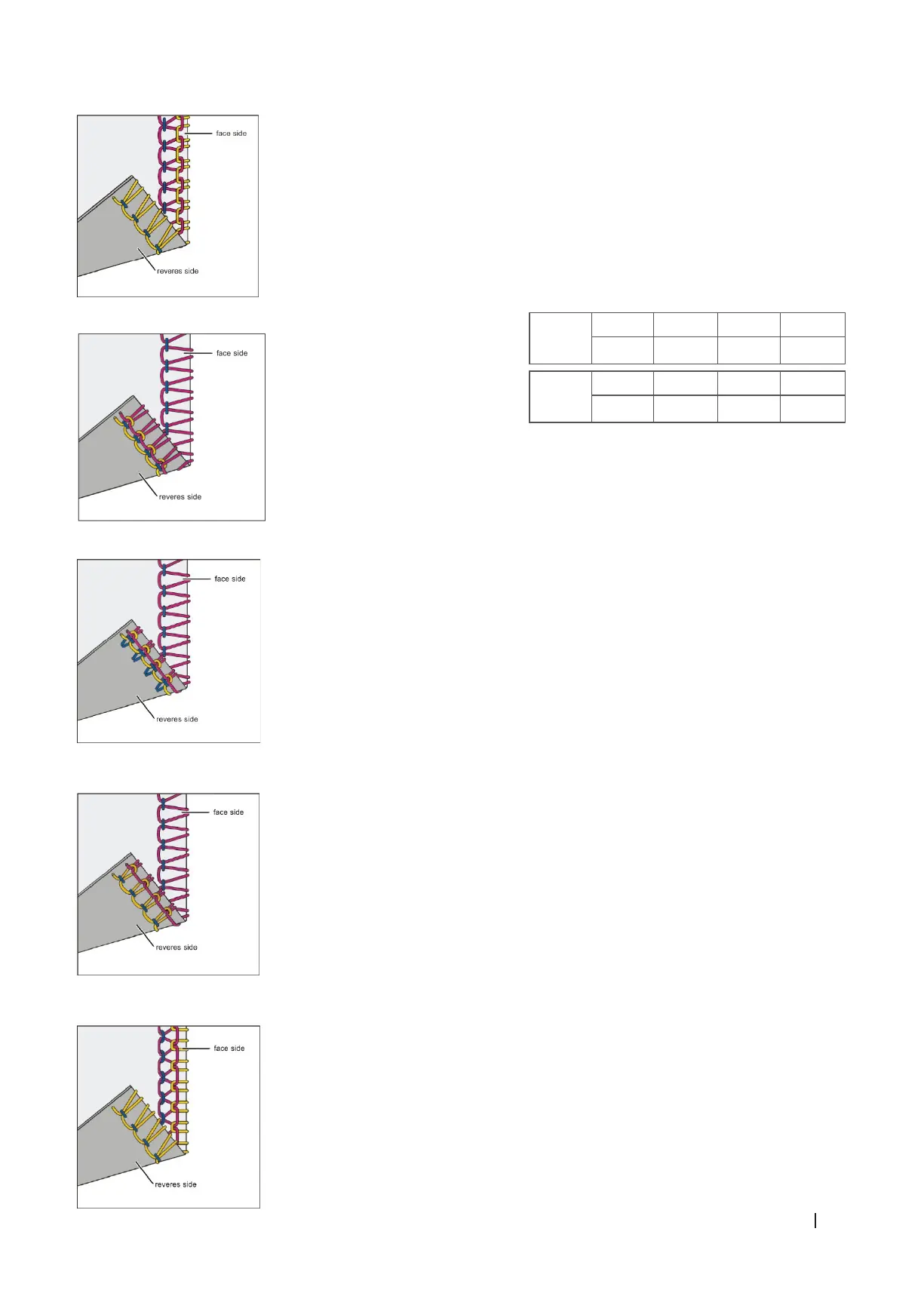 Wenn der Faden des unteren (gelben) Greifers auf der rechten Seite des Stoes sichtbar ist, erhöhen Sie die Spannung des gelben Fadens oder
