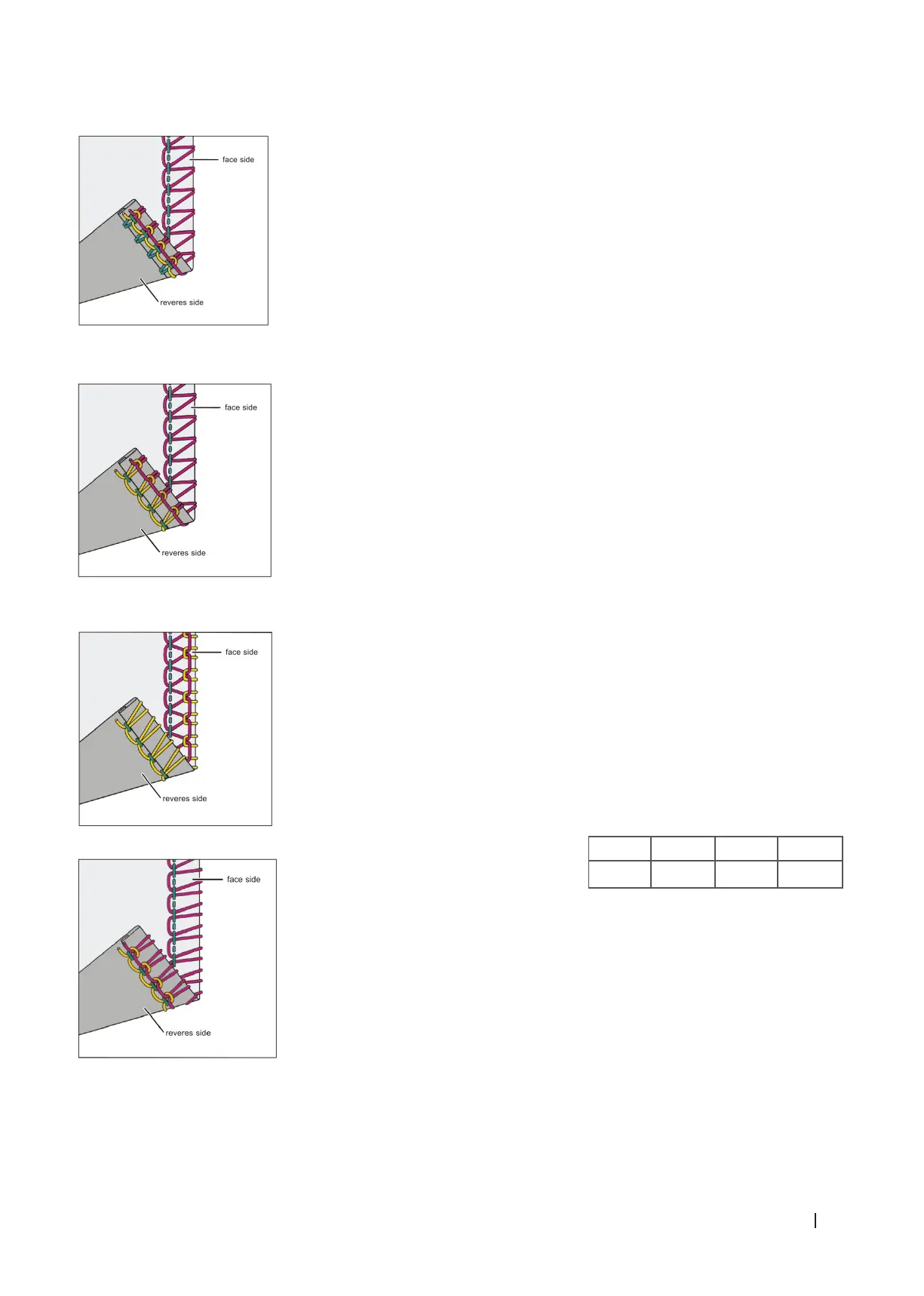 Wenn der Faden des unteren (gelben) Greifers auf der rechten Seite des Stoes sichtbar ist, erhöhen Sie die Spannung des gelben Fadens oder