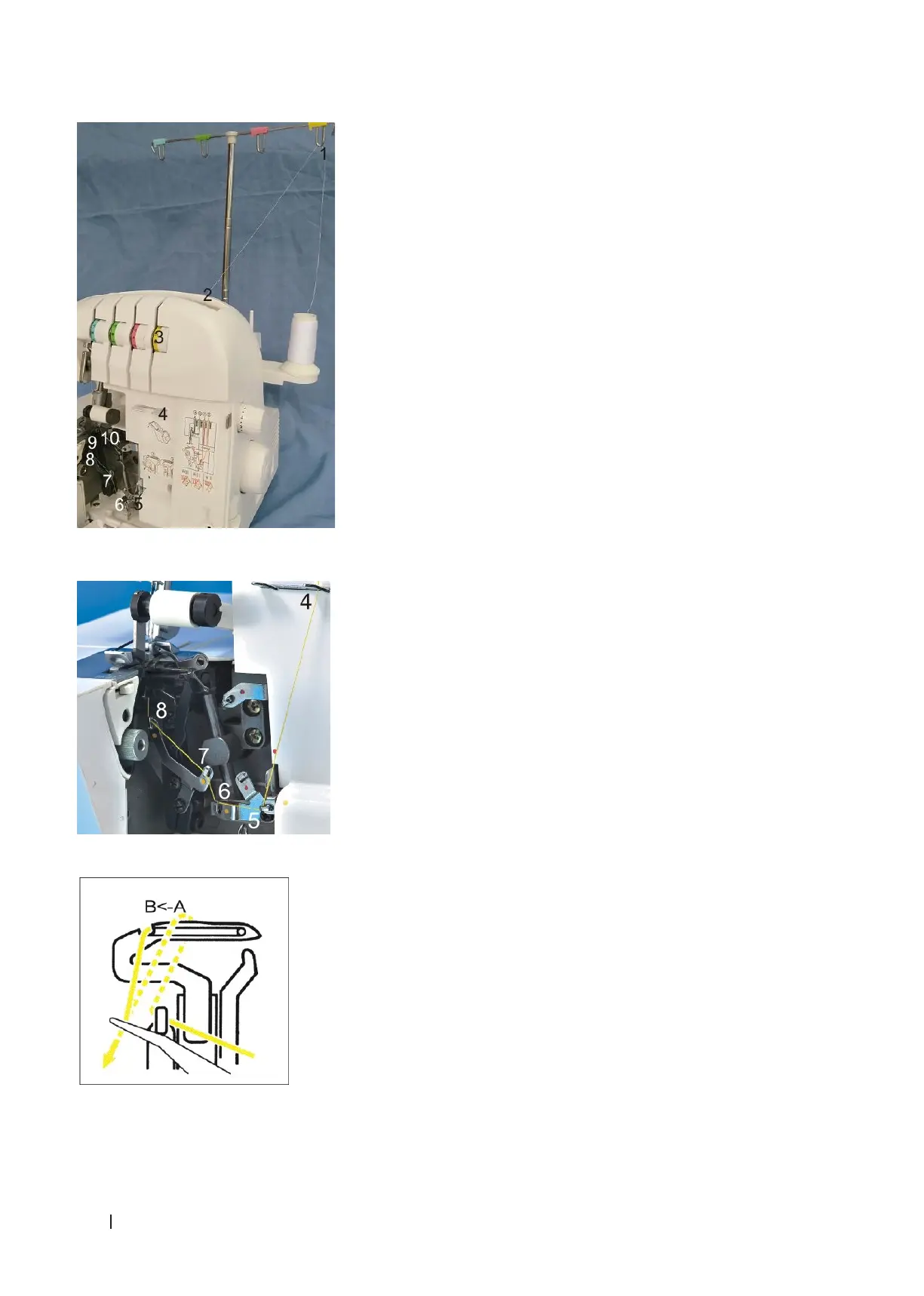 Introduzca el hilo por el recorrido marcado en amarillo a través de las guías 4-8.
