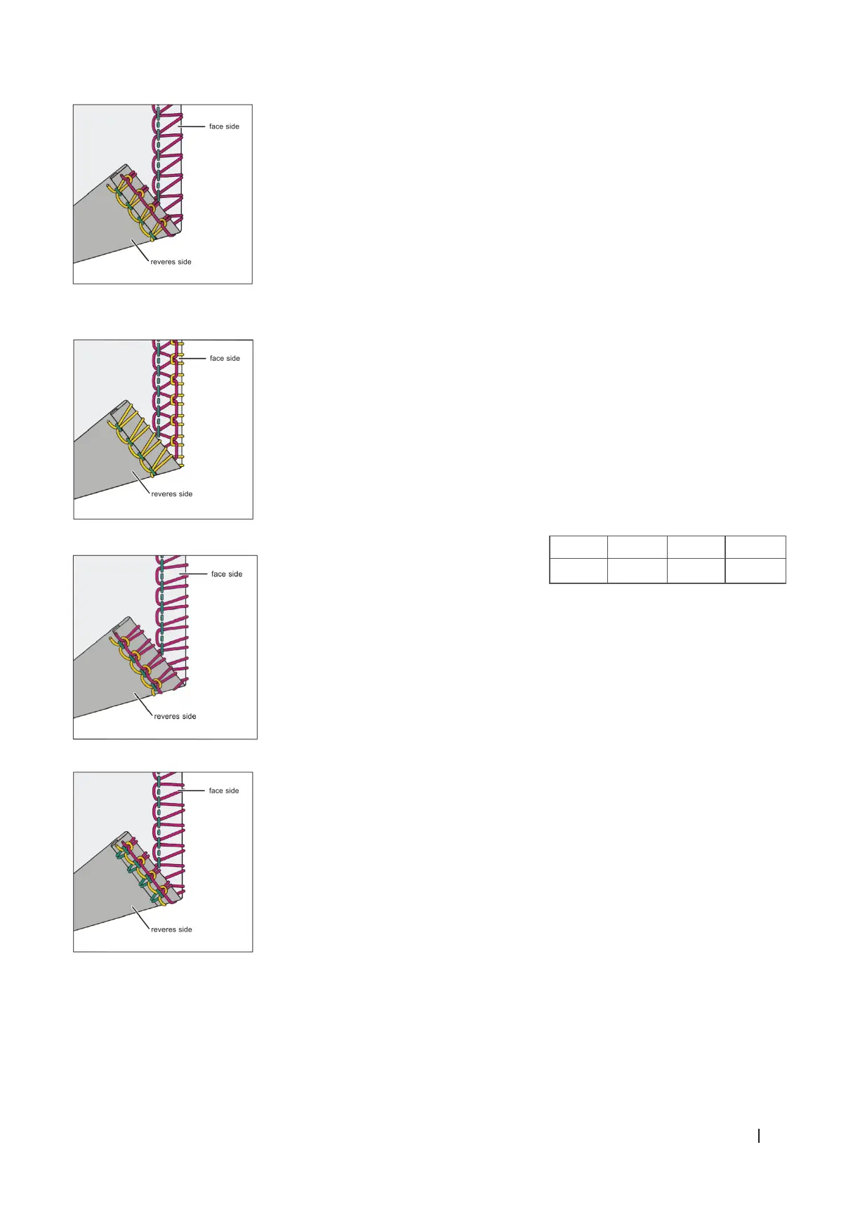 If the lower looper thread (yellow) is visible on the right side of the fabric, increase the tension of the yellow thread or reduce the tension of the