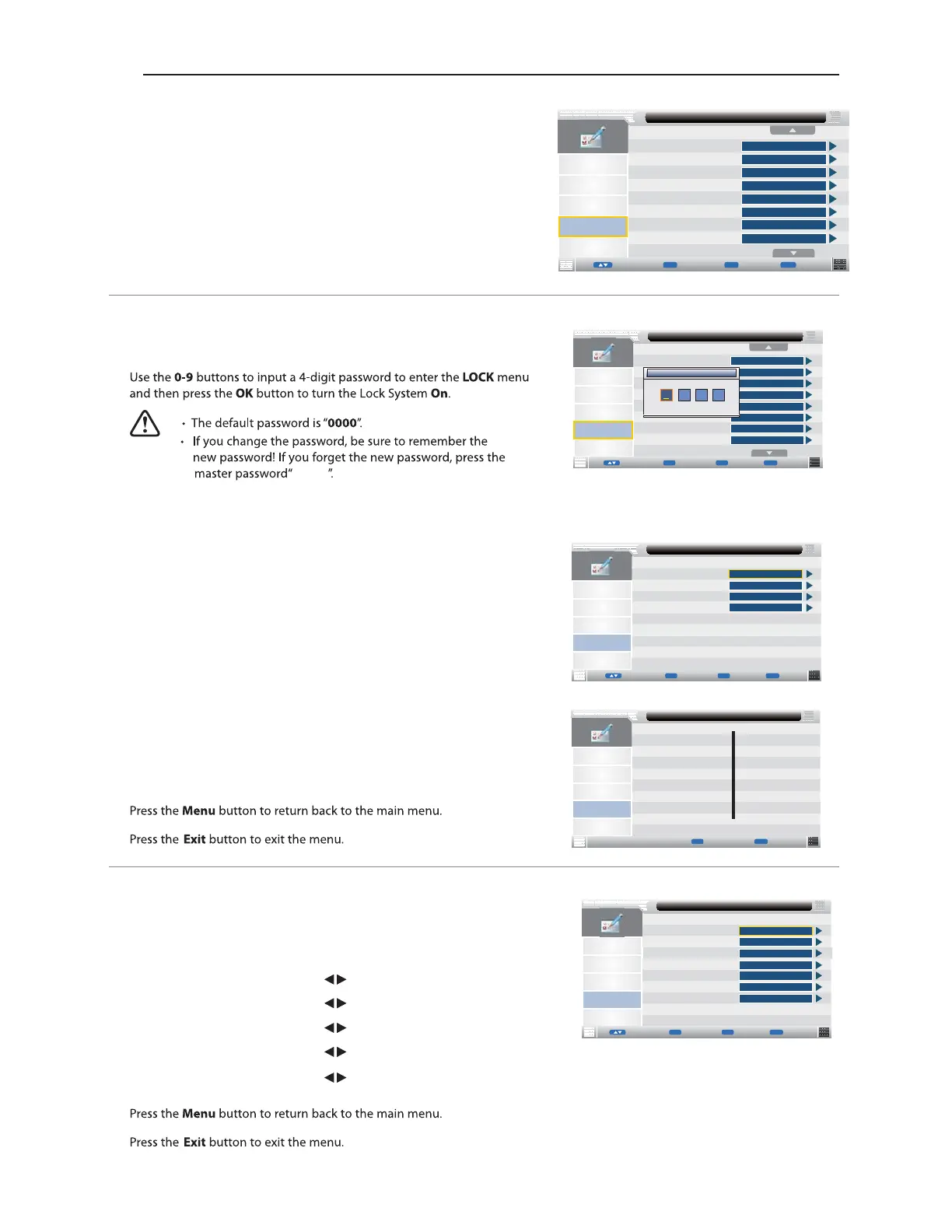 For Auto, Manual tune and TV reset a password will also